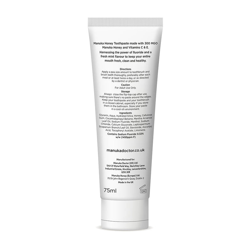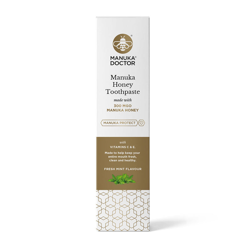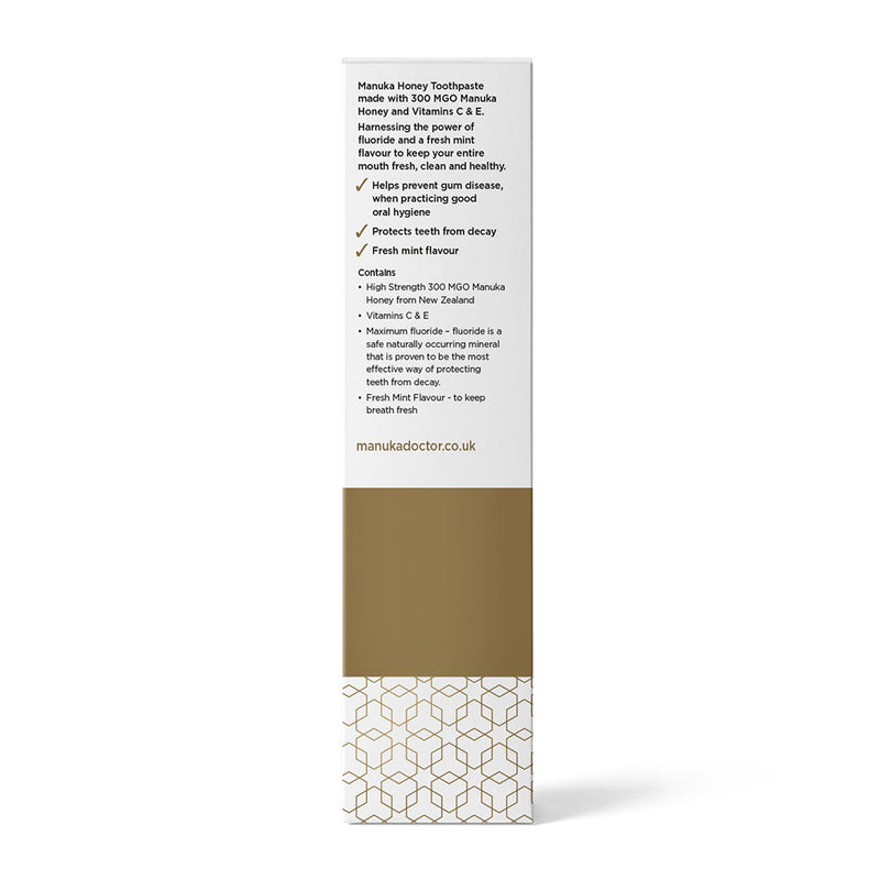 Manuka Honing Tandpasta gemaakt met hoog geconcentreerde 300 MGO Manuka Honing uit Nieuw-Zeeland, plus Vitamines C & E.
